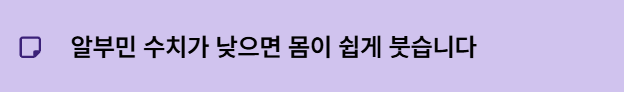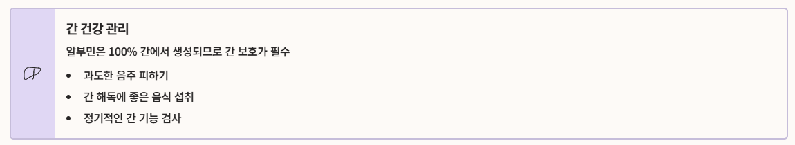 - 간 건강 관리: 알부민은 100% 간에서 만들어지므로 과도한 음주를 피해야 알부민 효능을 유지할 수 있습니다.