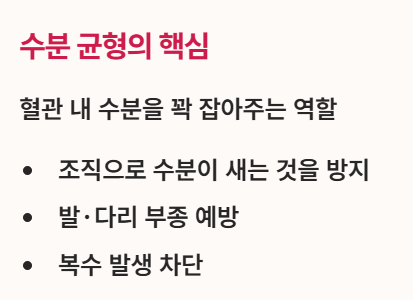 가장 대표적인 알부민 효능은 혈관 안팎의 수분 균형을 맞추는 삼투압 조절입니다. 알부민이 혈관 내 수분을 꽉 잡아주는 알부민 효능 덕분에 수분이 조직으로 새어 나가지 않아 몸이 붓는 부종을 막아줍니다. 만약 알부민 효능이 떨어지면 발이나 다리가 붓고 심한 경우 복수가 찰 수 있습니다.