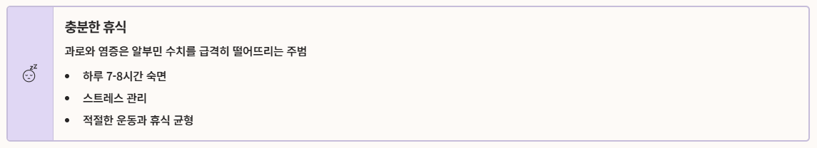 - 충분한 휴식: 과로와 염증은 알부민 효능 수치를 급격히 떨어뜨리는 주범입니다.