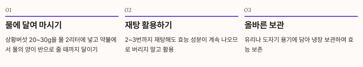 - 재탕 활용: 상황버섯은 2~3번까지 재탕해도 상황버섯 효능 성분이 계속 나오므로 버리지 말고 활용하세요.